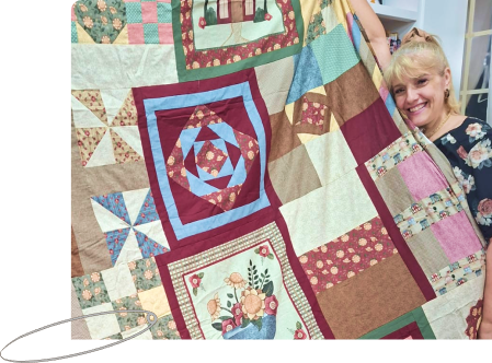 Sou pedagoga e artesã há mais de 30 anos, com mais de 20 anos de experiência ensinando patchwork e costura criativa. Sou casada e mãe, e ao longo dessa jornada, descobri que a costura é uma forma de expressão e autodescoberta.